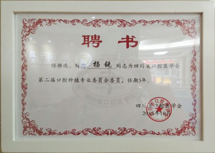 2015年10月特聘杨锐同志为四川口腔医学会******届口腔种植专业委员会会员聘书