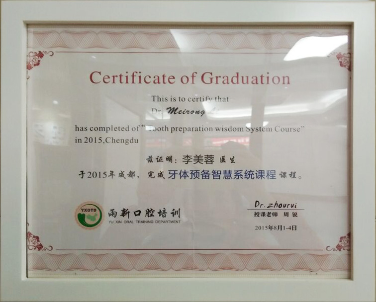 2015年8月份李医生成都完成“牙体预备智慧系统课程”证书